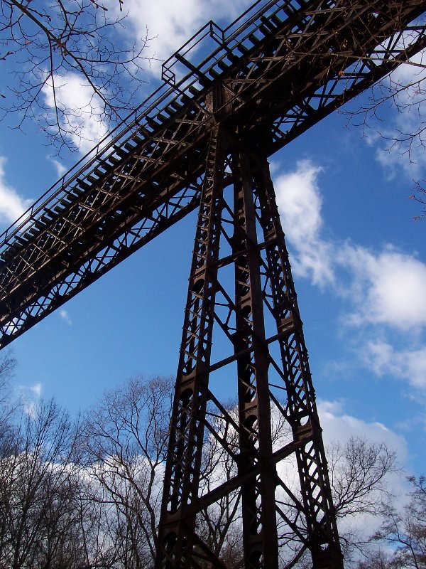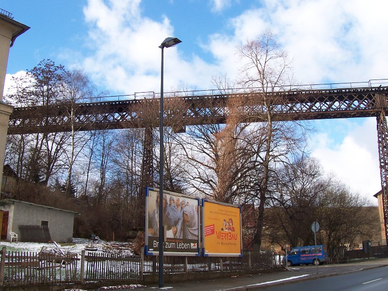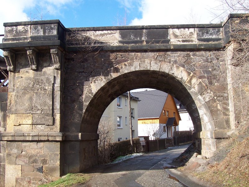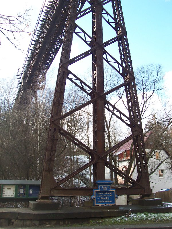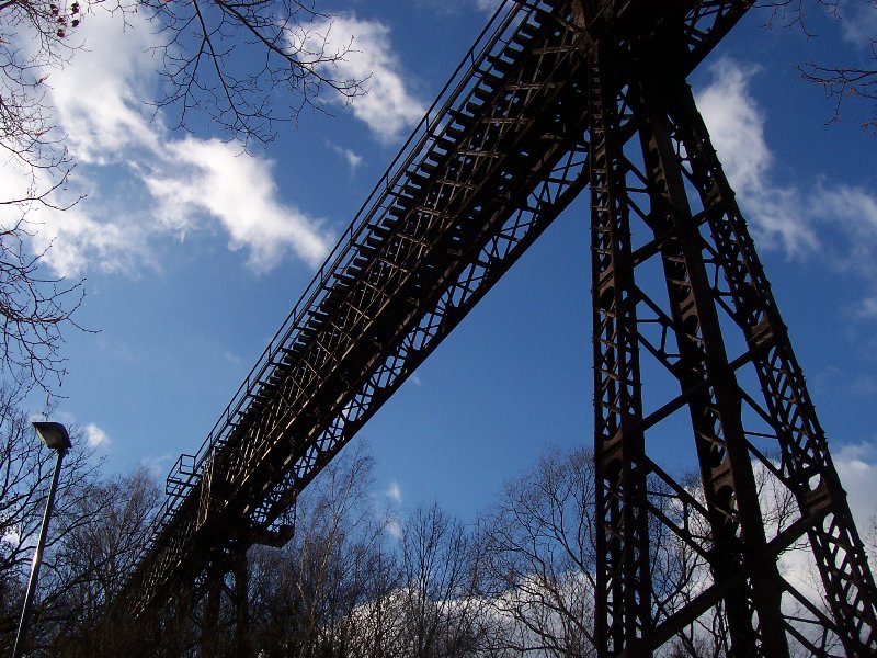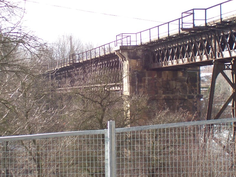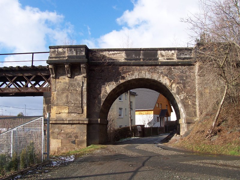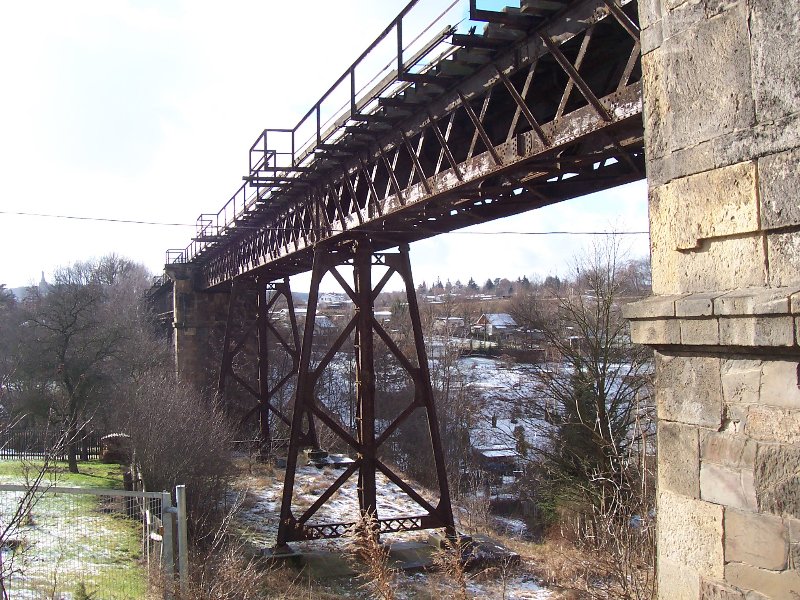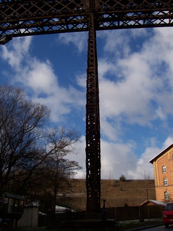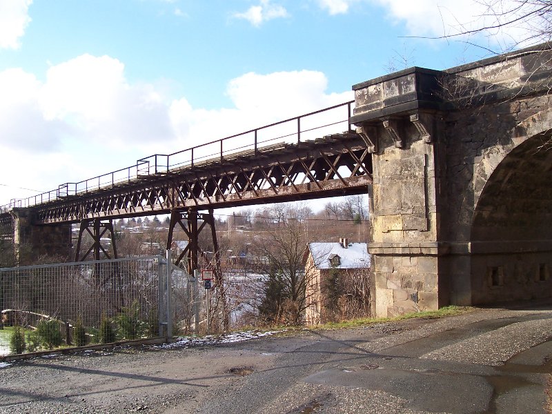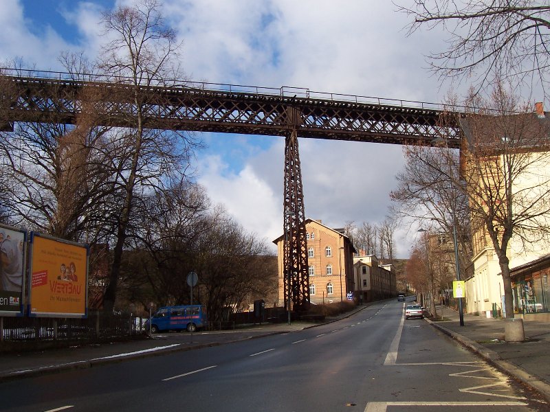 Oschütztal-Viadukt bei Weida Eine ingenieurtechnische Meisterleistung Ein Streit der preußischen und sächsischen Staatsbahn führte Ende des vergangenen Jahrhunderts zur Entstehung einer eingleisigen Eisenbahnlinie über das Tal des Oschützbaches. Ziel war, die Strecke über Weida-Altstadt nach Mehltheuer an den Gemeinschaftsbahnhof Weida anzubinden. Dieser "Hauptbahnhof" wurde von der preußischen Eisenbahn verwaltet, hatte jedoch einen sächsischen Teil, da die sächsische Staatsbahn die Strecke Weida - Werdau betrieb. Die Preußen wollten die Strecke nach Mehltheuer über den geschütteten Bahndamm führen und in ihren Teil des Bahnhofs einmünden lassen. Da dieser geschüttete Damm des Öfteren ins Rutschen geriet, entschieden sich die Sachsen zum Bau eines Viaduktes über das Oschütztal. Die Strecke mündete in einem Bogen in den sächsischen Teil des Weidaer Bahnhofs ein. Mit der Leitung der Bauarbeiten wurde der Geheime Finanzrat Köpcke beauftragt. Ingenieur Krüger projektierte die Gitterbrücke auf pendelnden Pfeilern. Die Pendelstützen sind gelenkig angeordnet, so dass sie Schwankungen beim Befahren der Brücke oder bei Temperaturänderungen ausgleichen können. Eine Pendelstützenbrücke dieser Größenordnung - 185 m lang und 28 m hoch - wurde zur damaligen Zeit erstmals in Deutschland errichtet. Es war die Zeit, als ein gewisser Eiffel in Paris einen Turm baute, dessen Gitterkonstruktion Ingenieur Krüger inspiriert haben muss. Am 1. Oktober 1894 war das ingenieurtechnische Meisterwerk fertig. Fast 100 Jahre lang rollten Züge über den Viadukt. Die ständig gestiegenen Lasten machten zunächst den Einbau eines Mittelträgers in sämtlichen Überbauten und das Anbringen von zusätzlichen Aussteifungen in die Pendelstützen erforderlich. Das war schon 1915. Trotzdem war bald die Grenznutzungsdauer erreicht. Am 22.September 1983 fuhr der letzte planmäßige Personenzug über den Viadukt. Die neuverlegte Strecke führt am Bahnkörper der Linie Weida - Saalfeld entlang und bindet hinter dem Viadukt in die Strecke Werdau - Weida - Mehltheuer ein. Heute hat der Viadukt als Schienenverkehrsanbindung längst ausgedient. Da er aber eines der bedeutendsten Brückenbauwerke dieser Art in Deutschland ist, wurde der Oschütztal-Viadukt als Technisches Denkmal unter Schutz gestellt. Im Ortsbild der Stadt Weida dominiert dieses Industriedenkmal, das auch von verkehrsgeschichtlicher Bedeutung für das Land ist. Das Thüringische Landesamt für Denkmalpflege hat eine Studie in Auftrag gegeben, die zu dem Ergebnis kommt, dass eine Sanierung ca. 1,75 Millionen Euro kosten würde. Eine halbe Million würde der Abriss kosten. Der Abriss steht jedoch überhaupt nicht zur Debatte, zumal laut Gutachten und letzter Hauptprüfung in den nächsten Jahren keine Gefährdung vorliegt. Der Viadukt ist noch zu retten! Würde man die 1915 eingebauten Stützelemente beseitigen und die immer noch liegenden Bahngleise entfernen, würde die Gitterbrücke erheblich entlastet. Bringt man dann einen leichten Deckenbelag auf, so könnte ein Fuß- und Radweg entstehen.