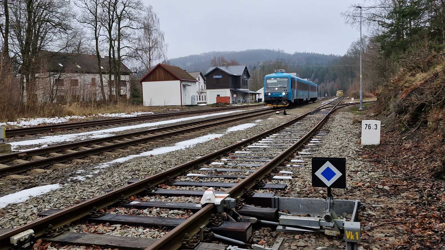 Im Vordergrund die ankommende Strecke von Bakov nad Jizerou (Bakow)