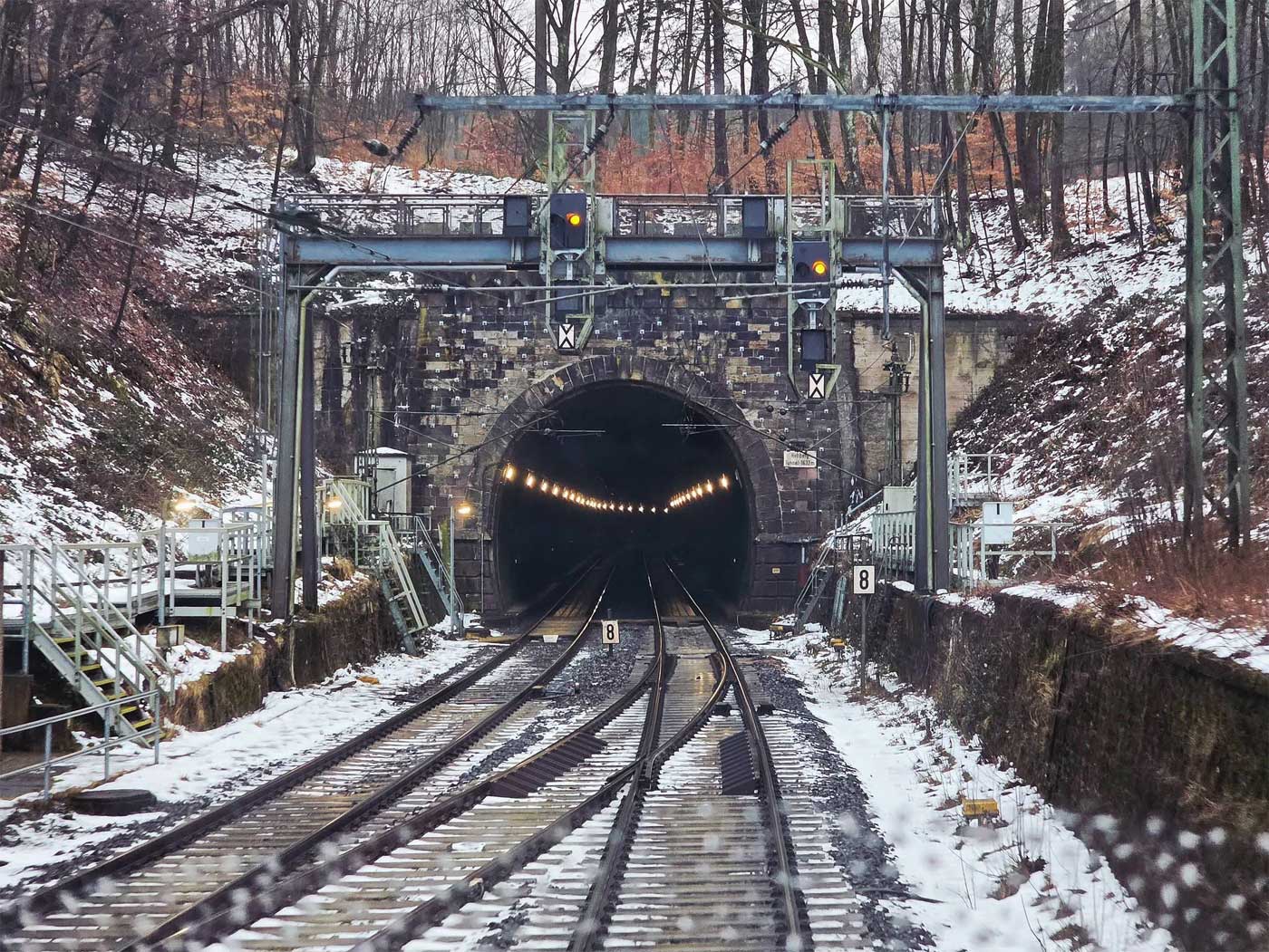 Der Eggetunnel durchquert bei der ostwestfälischen Stadt Willebadessen das Eggegebirge. Er wurde von 1996 bis 2003 gebaut und ersetzte damit eine weiter östlich verlaufende oberirdische Trassierung, die über instabiles Gelände verlief und durch eine Hangabrutschung beschädigt wurde. Im Bereich der Eggequerung wurde daraufhin auf 12,8 km eine Verlegung der Linie durchgeführt. Der Glaseberg wird jetzt mit einem Tunnel unterfahren, der für eine Geschwindigkeit 200 km/h ausgelegt ist. Wegen fehlender Signaltechnik (Linienzugbeeinflussung bzw. ETCS) dürfen die durchfahrenden Züge derzeit aber nur maximal 160 km/h schnell sein. Außerdem wurde vom Eisenbahn-Bundesamt angeordnet, dass sich wegen der einröhrigen Bauweise keine Personen- und Güterzüge im Tunnel begegnen dürfen. Für den Neubauabschnitt musste eine teilweise 70 Meter breite Schneise durch den Wald geschlagen werden. Als Ausgleichsmaßnahmen wurden zwei Waldgebiete über eine neu angelegte, 68 ha umfassende, Waldfläche miteinander verbunden. Der Bahnhof Neuenheerse wurde aufgegeben; der Bahnhof Willebadessen wurde im Zusammenhang mit dem Tunnelbau völlig umgebaut und wieder für den Personenverkehr geöffnet. Quelle: Wikipedia, Egge-Tunnel Dieser Text ist unter der Lizenz Creative Commons Attribution / Share Alike verfügbar. |