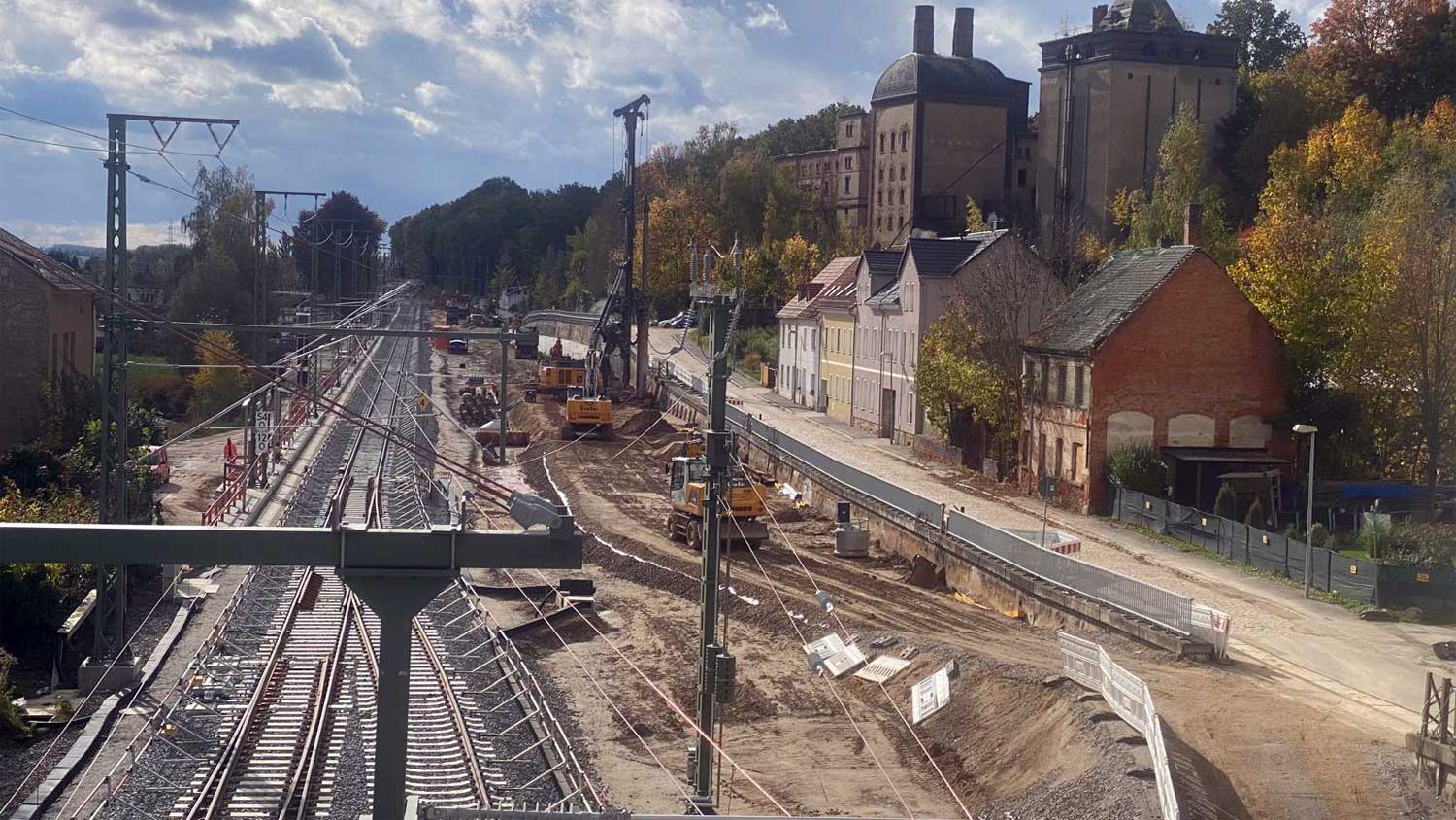 Einmündung vor Gößnitz - man beachte die Einfach-Oberleitung (ohne Tragseil)