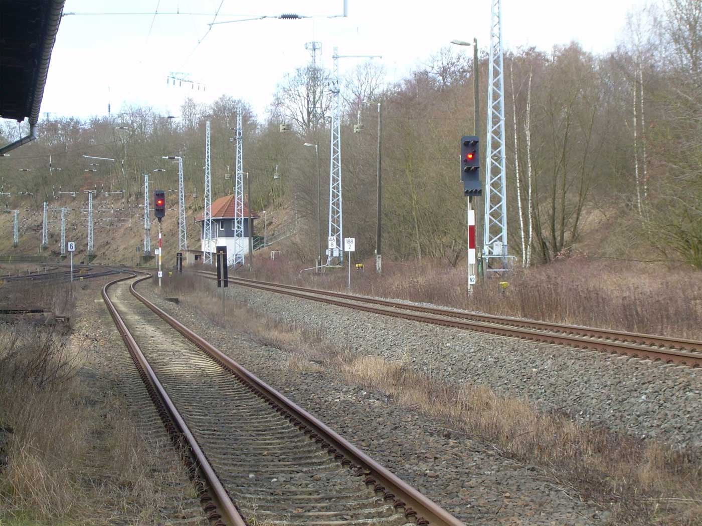 Im Hintergrund von rechts kommend das Richtungsgleis