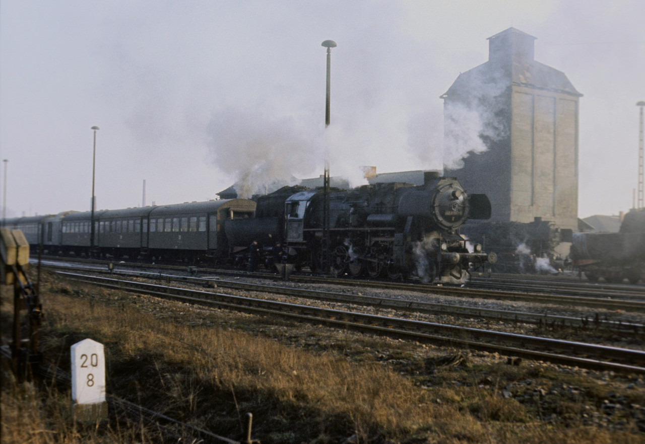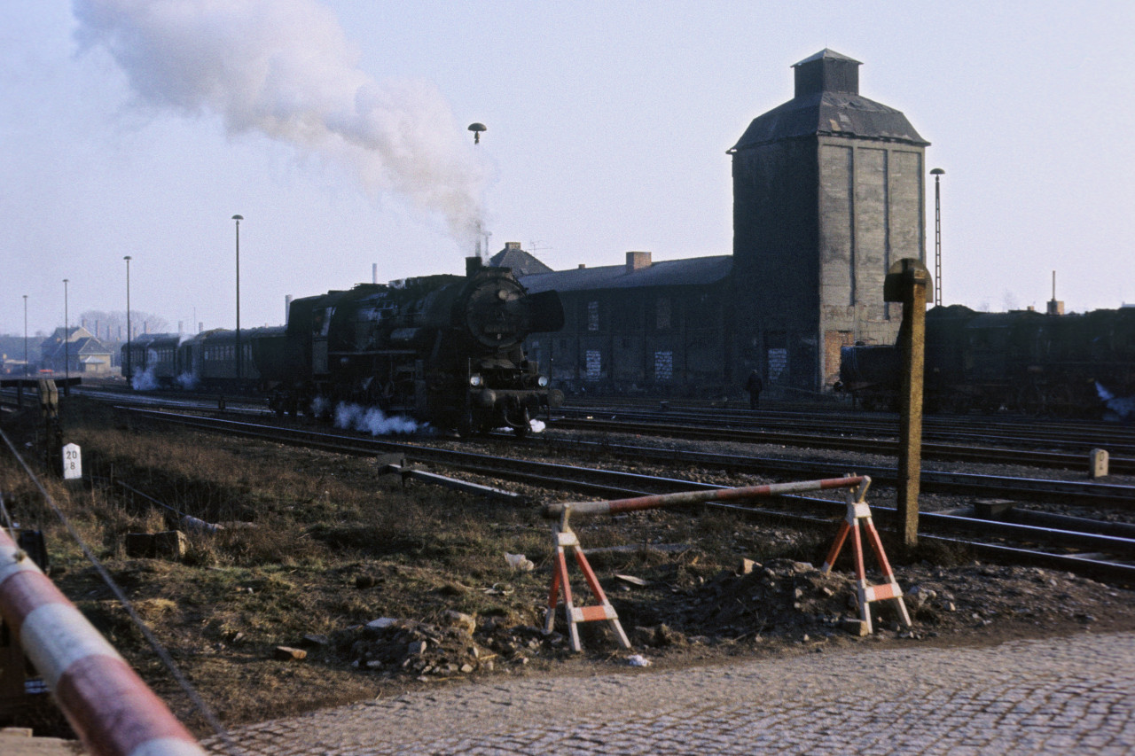 52 8150 mit Personenzug, rechts daneben 52 8144, im Hintergrund V 100 und 52 8136