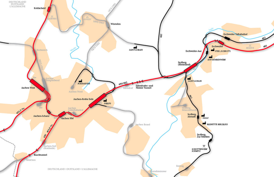 Streckenverlegungen. Die Überlängen wurden an der früheren Köln/Elberfelder