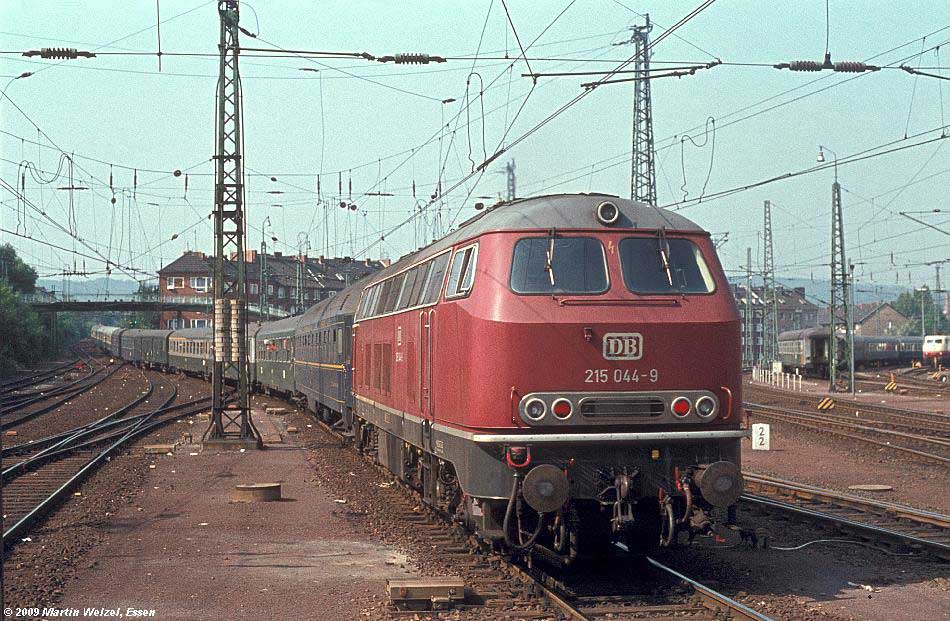 215 044 schiebt den D 234 (Kopenhagen - Paris-Nord) am 08.07.1977 aus dem Aachener Hbf die Rampe nach Aachen-Süd hinauf.