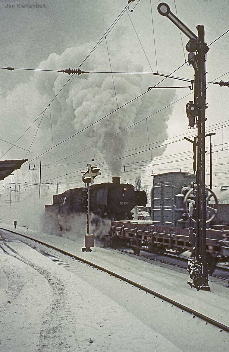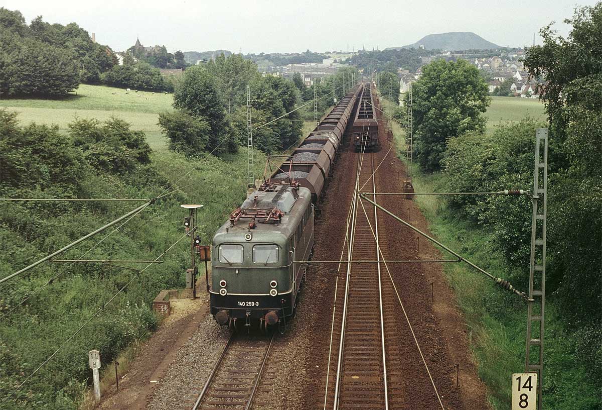 Während der leeren Kokszug noch im Bahnhof Herzogenrath einfährt, ist DB-Lok 140 259 schon wieder mit einem neuen vollen Kohlenzug auf Achse in Richtung Aachen (auf der Steigung nach Kohlscheid). Der Zug wird von der DB-Lok 140 645 nachgeschoben,