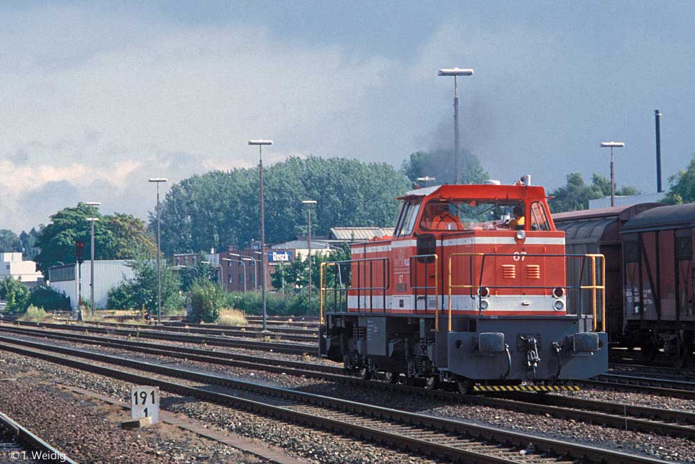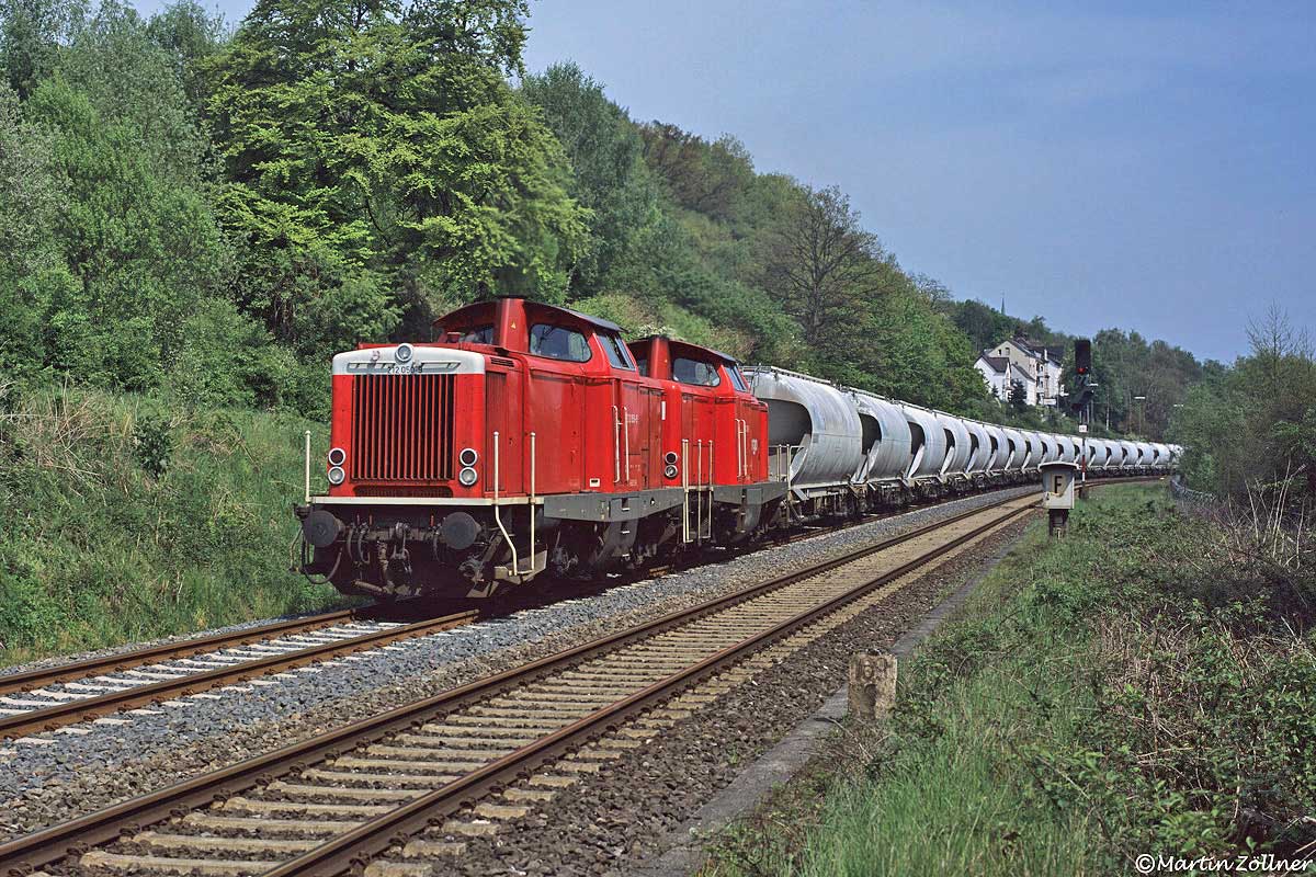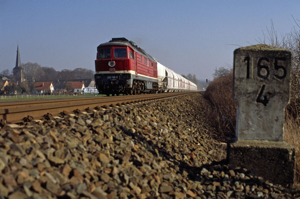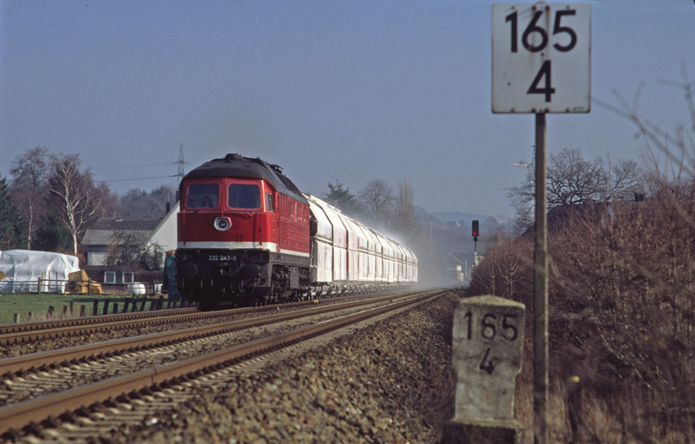 1997 gelangen mir kurz hintereinander zwei Aufnahmen bei Fröndenberg-Dellwig, wo heute der Ruhrtalradweg verläuft und mit Glück noch immer 232 zu sehen sind. Erst erschien 232 326 mit dem schweren 2000-Tonner nach Bremen, lautstark wie gewohnt. Die Loks der Erstausstattung, die 1993 noch mit der Bezeichnung „Deutsche Reichsbahn“ nach Oberhausen kamen, erhielten ein Jahr später den AG-Keks nicht nur auf die Seitenwand, sondern auch noch auf die Front gepappt, in diesem Fall auch noch schief. Viele von ihnen wurden übrigens später, weil es mit dem Fristablauf gerade so hinkam, noch zur Remo-Baureihe 233.