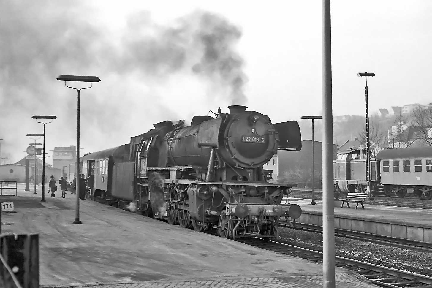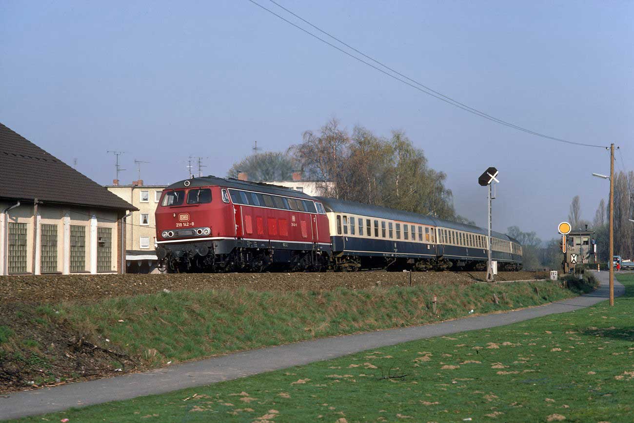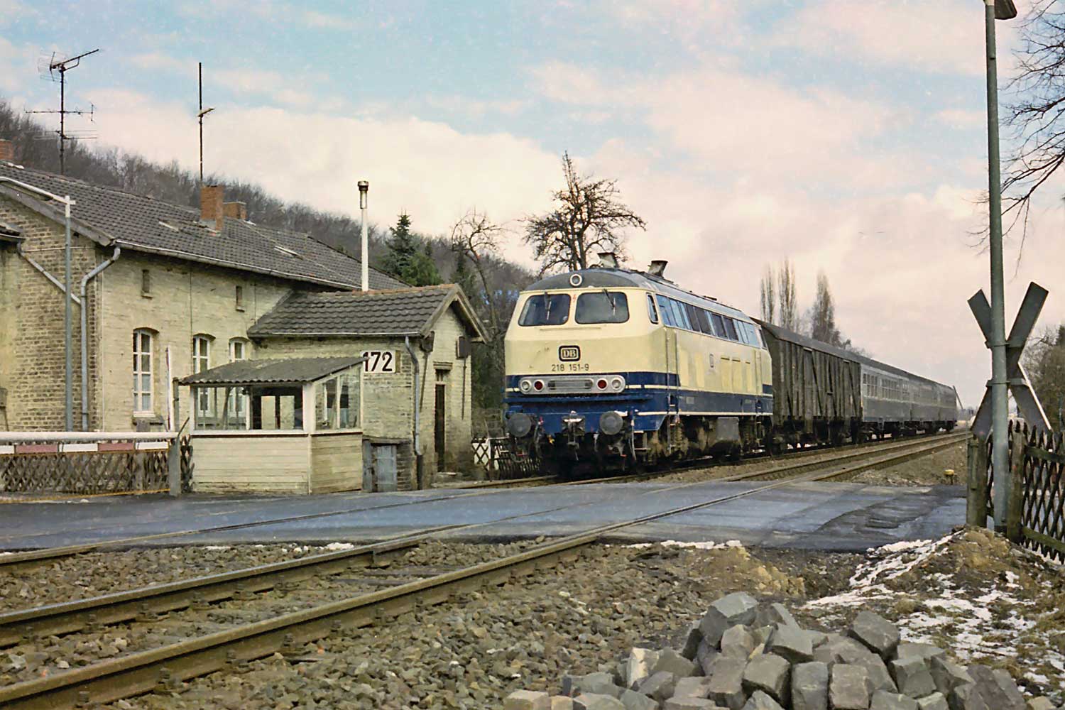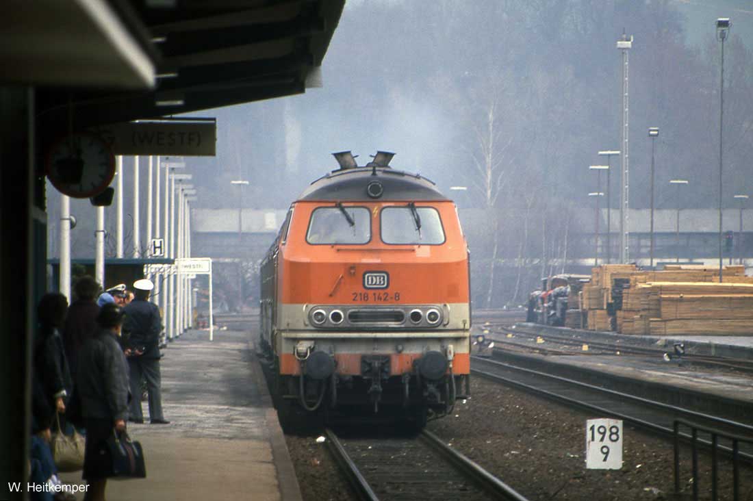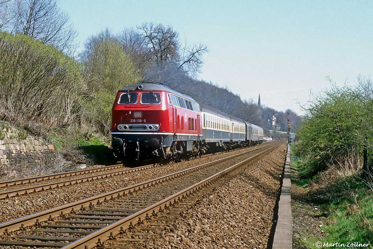 Arnsberg (Westf) - km 199,1 - 218 128 mit Schnellzug Bebra - Köln im Mai 1985