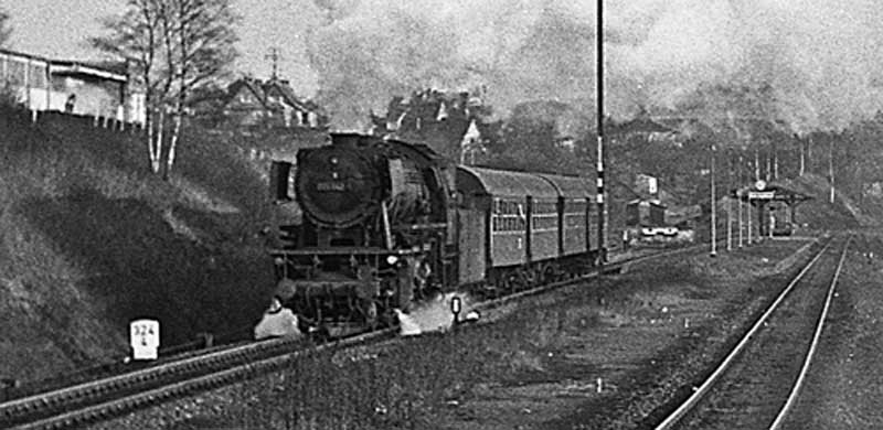 km 324,4 in Grebenstein - die Bestwiger 23 042 (Bw Bestwig) verläßt den Bahnhof pünktlich mit P 2688 Kassel-Warburg